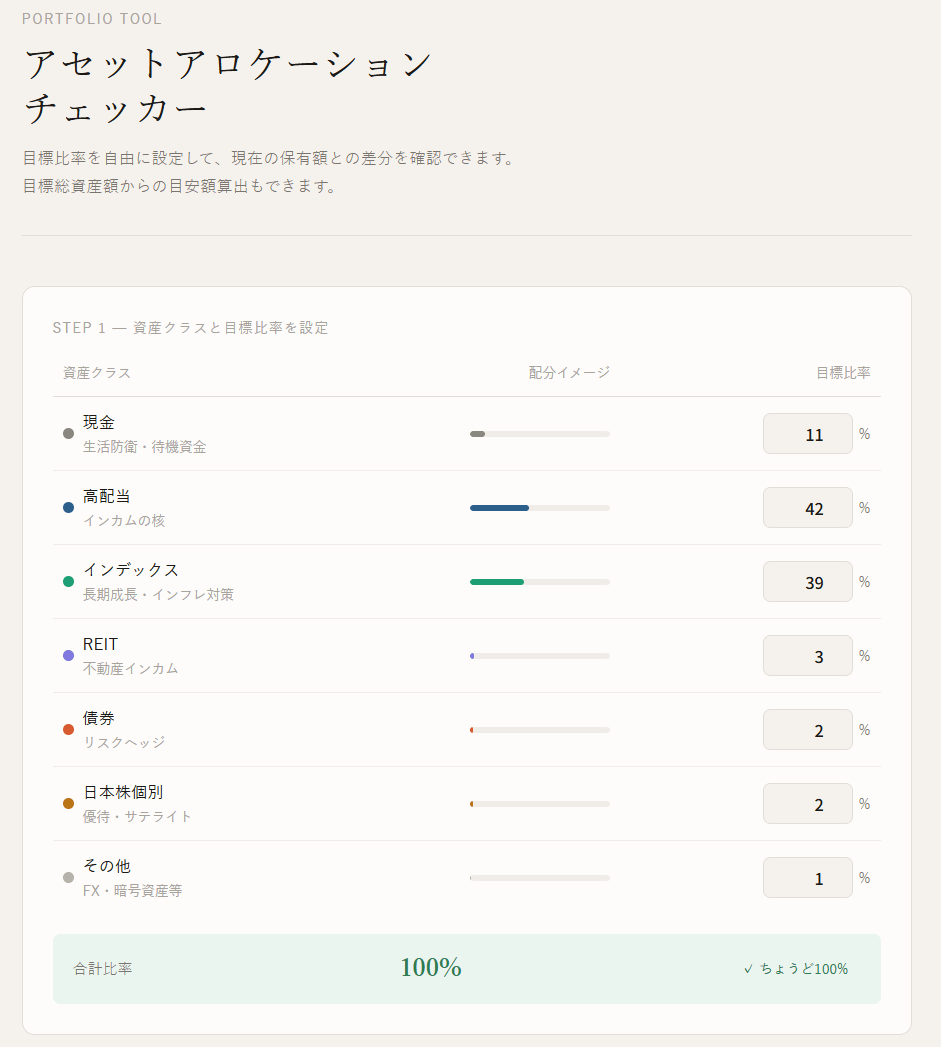 本ツールでは、配当重視型、インデックス中心型、安全資産重視型など、自分の戦略に応じた最適配分を直感的に確認できます。
