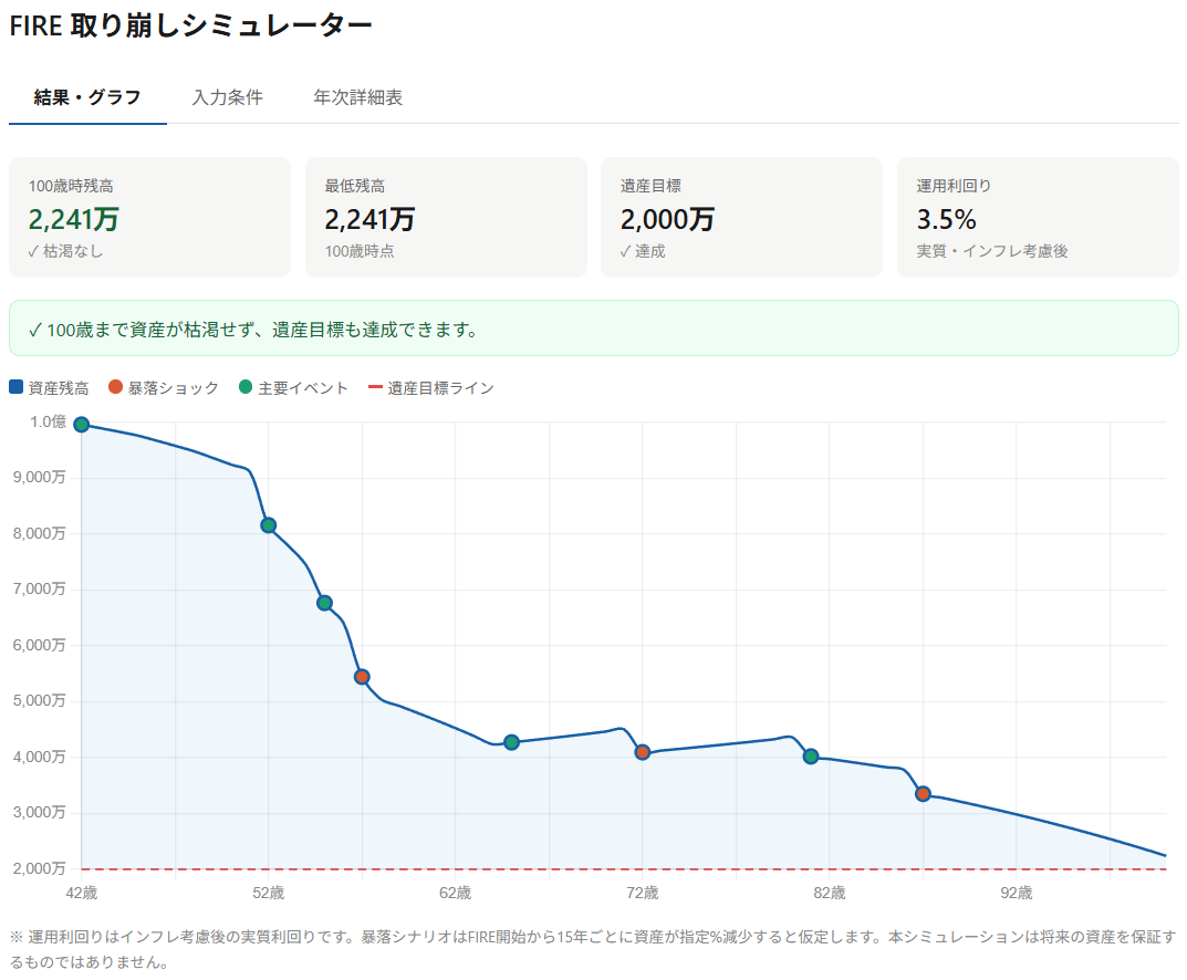 • 暴落シナリオ: FIRE開始から15年ごとに、指定した割合(%)で資産が減少すると仮定します。